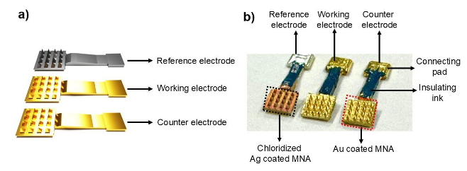 б) Оптичне фото пластиря на основі мікроголок (MNA-based patch), який містить еталонний електрод Ag/AgCl та робочий і протилежний електроди з покриттям Au. Шар срібла згодом хлорували для отримання Ag/AgCl: для цього електрод із нанесеним Ag занурювали в розчин для хлорування, що складався з 0,2 М HCl та 0,25 М FeCl₃, протягом 10 секунд.