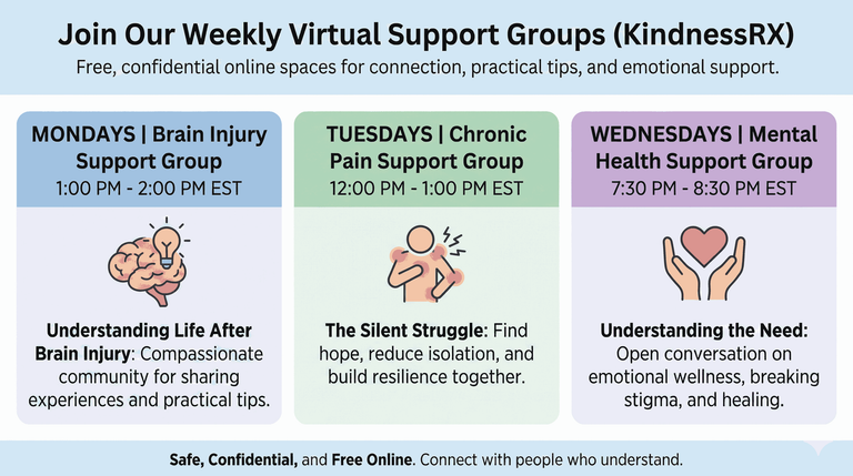 KindnessRX hosts free online support groups each week. Details are on the KindnessRX site (KindnessrRX) and the Luma calendar. (luma.com)