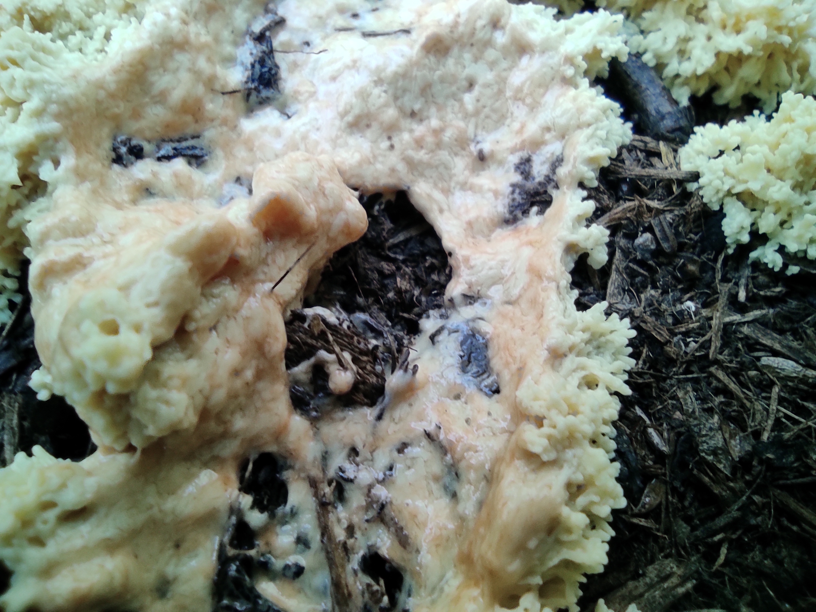 I call it "cheese bread", because it looks like porous bread crusted in melted cheese. It grows on top of the soil. In my yard it only grows on top of decomposing wood chips.