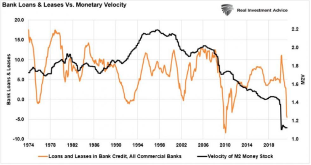 The extraordinary amount of liquidity injected into the financial system as usual has not and will not be transferred to the real economy. This is evidenced by the fact that the lending and leasing capacity of banks (orange line) is always at historic lows, as is the "monetary velocity" (black line), i.e., the circulation of money in the economy.