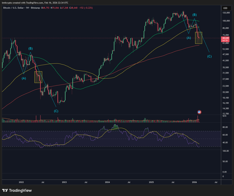 In the 2022 B→C wave, there was only one green weekly candle — the lower‑high relief. That candle was the trap before the second flush.