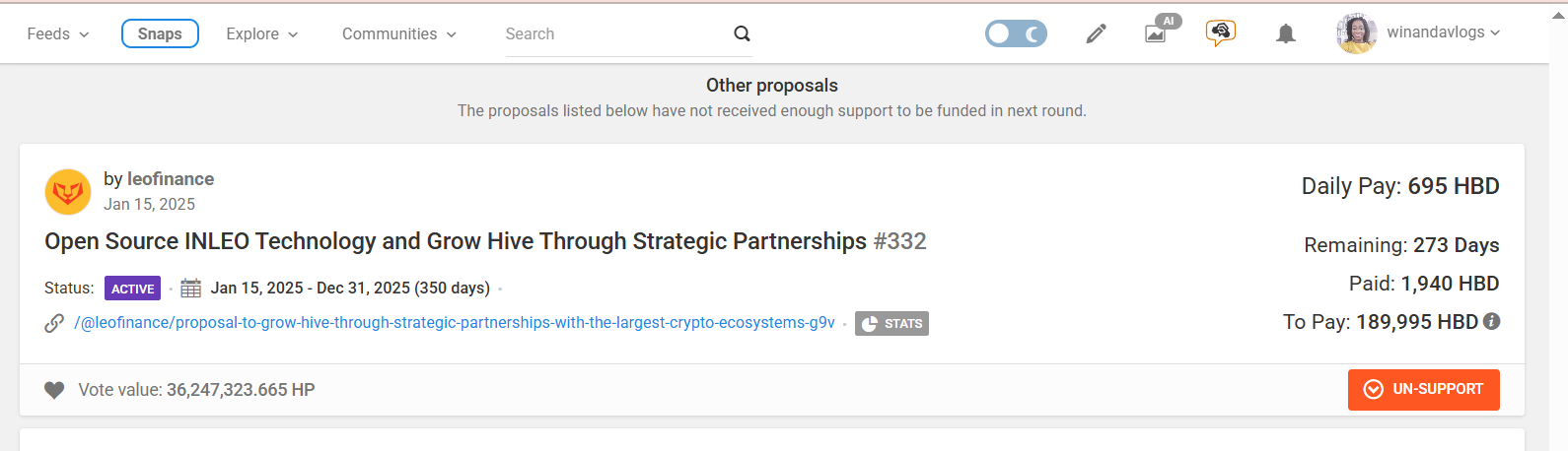 I've been on Snaps with this account, trying to get it active and grow it. Not a #newlion. I just voted on INLEO's proposal. Link to vote 👇
