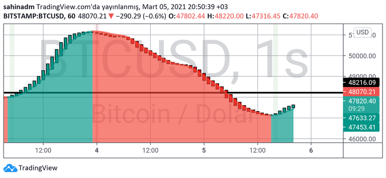 Saatlik grafikte şu an bir süredir bahsini ettiğimiz ve önemli bulduğumuz 48216$ seviyesi ile ciddi bir boğuşma var. Bu seviyenin üzerine çıkıp sabaha kadar kalıcı olmayı başarabilirse yarın için güzel sinyaller gelmeye başlayacak. Şu an için saatlik grafikte 47540$ seviyesinin üzeri olumlu.