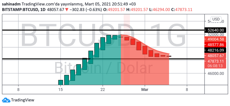 Günlük grafikteki en büyük umut veren etken, halen 48216$ altında ortalama seyrinin olmaması. Zaten bu gün halen 42000$ seviyelerine inmemiş olmasının tek nedeni budur.