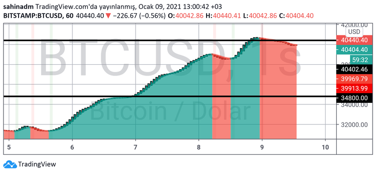 Destek ve dirençleri görebiliyoruz grafikte. Son günlük zirve 42000 Dolar direnci olarak belirlendi ve bu direnç şu an iyi çalışıyor. Daha aşağıda 40400$ seviyesi de direnç olarak çalışıyor fakat çok güçlü olmadığı için asıl baskıyı 42000$ direnci yapıyor.