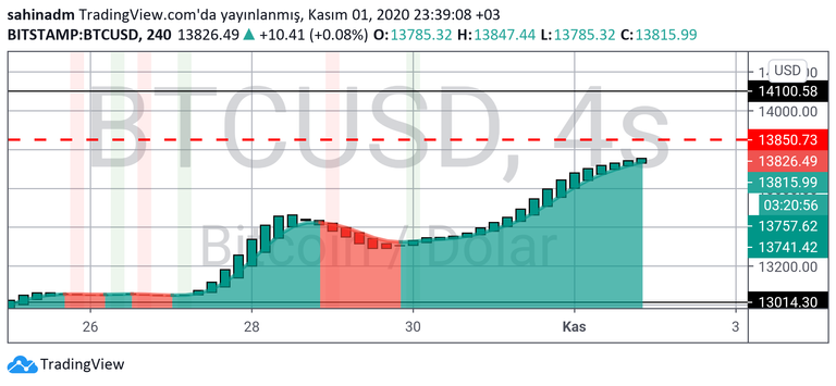 Direnç olarak 4 saatlik grafikte 14100$, destek olarak ise 13129$ seviyeleri var. 4 saatlik grafikte destek ve direnç arasındaki makas farkı, saatlik grafiğe göre daha geniş. Bu da hareket alanının daha ferah olduğunu gösteriyor. Bu bakış açısı yukarı yönlendirmelere sebep olabilir. Durum güzel.