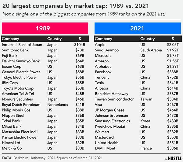 This table is a list of the top 20 companies, by market capitalization. It lists the ones in 1989 and contrasts this with 2021. Between, we have 32 years.