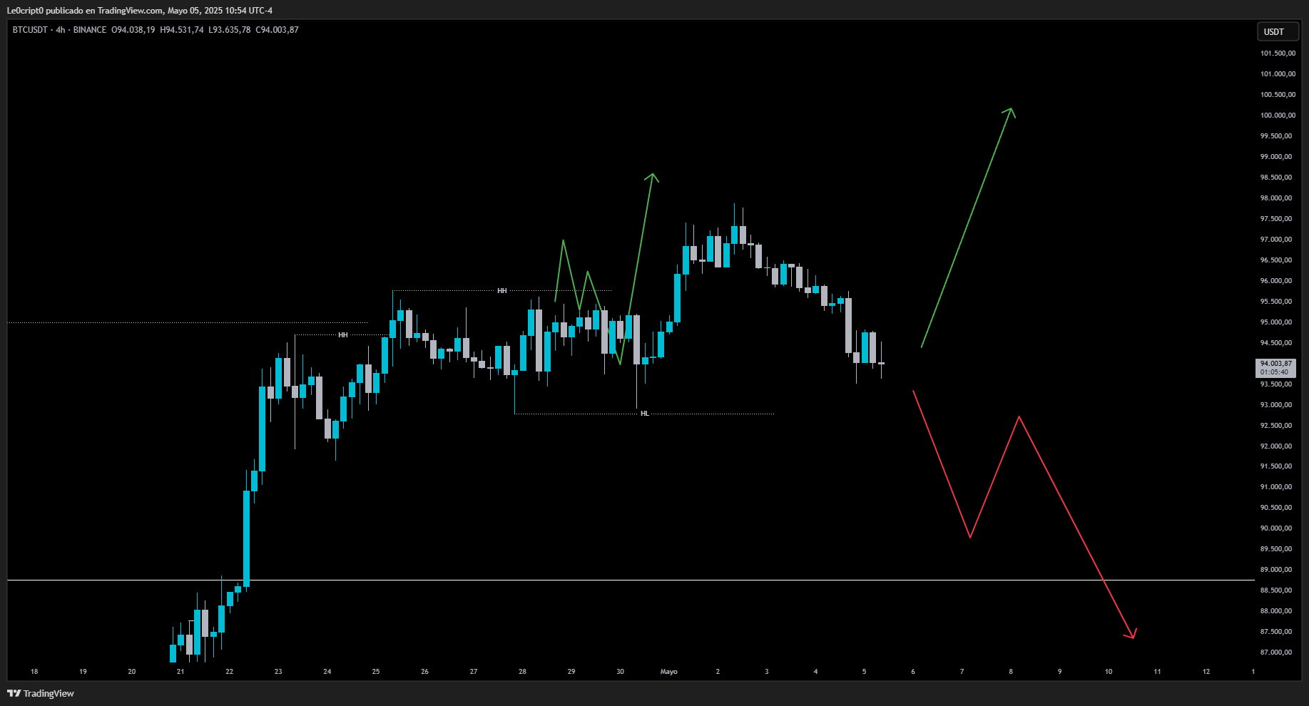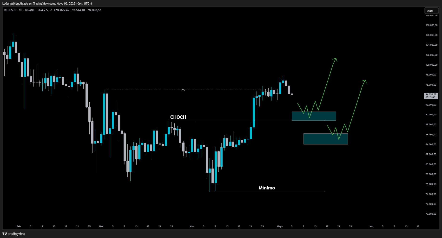Al momento de publicar este post el gráfico de 15 minutos es fundamental, nos encontramos en una zona de posible reversión para continuar con la tendencia alcista marcada en H4, una ruptura del Lower High marca un cambio de estructura de bajista a alcista que puede enviarnos a la zona de los 98K a 100K