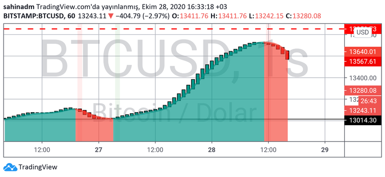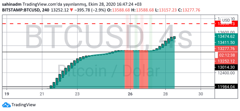 Ortalama mumlar daha 13850$ seviyesine ulaşmadı diye. Bu durum yeni küçük destek ve dirençler oluşturuyor. Reel fiyatın ise ortalama fiyatların üzerinde seyretmesi gerekiyor ki hareketler yukarı devam edebilsin. Şu an 4 saatlik grafikte böyle bir durum söz konusu değil. Bu yüzden eğer saatlik grafikteki satış baskıları ağır gelirse 4 saatlik satışlar da başlar ve fiyatlar iyice düşer. Satış yapmış yatırımcının tam da istediği gibi olur. Bu yüzden alım yapmak için erken; fakat tetikte olmak gerek. Satışını 13850$ civarında yapmış yatırımcının stratejisi için konuşuyorum. Yanlış anlatmayalım olayı. Neyse 13850$ direnci tüm güç varlığını koruyor. Aşağıda bekleyen önemli destek 13014$ ve daha aşağısını günlük grafiğe geçelim de öyle görelim.