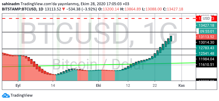 Günlük grafikte AL sinyali normal bir seyirle devam ediyor. Saatlik satışların etkisi son muma yansımış elbette; ama çok etkili değil. Daha çok 4 saatlik son mumlar etkilendi. Devam etmesi halinde yarınki günlük mumda da etkisi net olarak görünecek. Bu durum: "SAT siyalleri peş peşe geliyor kaçıııın!" durumu değil. Saatlik grafik takip edilmeli. Saatlik grafik tek başına AL-SAT yapmaya uygun değildir! Tamam bu kadar yeterli sanırım. Çok uzun olunca okumak zoruna gidiyor insanın. :) Günlük grafikte en yakın güçlü direnç 13850$ en yakın en güçlü destek 11500$ olarak belirlendi.