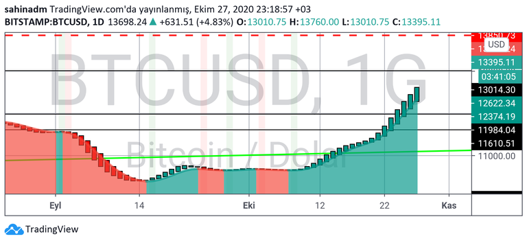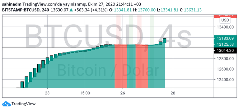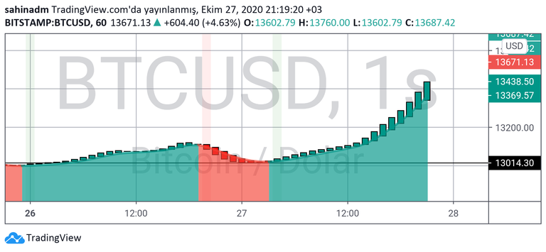 Bu gün sabah saatlerinde yazdığım yazıda saatlik grafiğin yükseliş hazırlığı yaptığı konusunda ip uçları vermiştim. Biraz daha desteğe ihtiyacı vardı ve o desteği bulunca beklemedi. Şimdi ise aynı 13014$ desteğinden aldığı güçle hareket etmeye devam ediyor. Sırada çok fazla öneme sahip olan bir direnç olan 13850$ seviyesi var. Burayı test etmesi, önündeki son güçlü desteği denemesi demek. Evet 8400$, 9800$ 10000$ ve 11500$ gibi dirençleri desteğe çevirdikten sonra artık önünde daha güçlü bir direnç kalmıyor. Çünkü 20000$ seviyesinden düşerken durak yaptığı ilk önemli destek görevi gören seviye 13850$ seviyesi idi. Yukarıda neler olacağını merakla beklerken aşağıda 12773$ seviyesinin de varlığını unutmayalım.