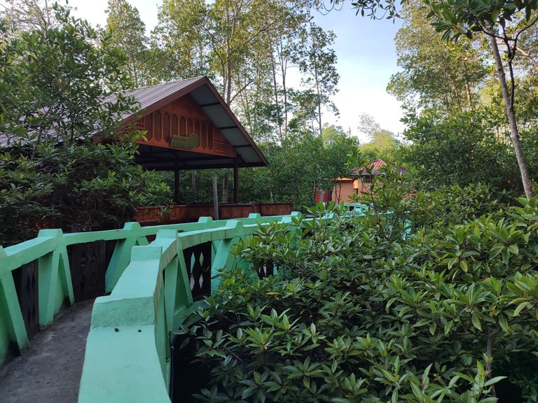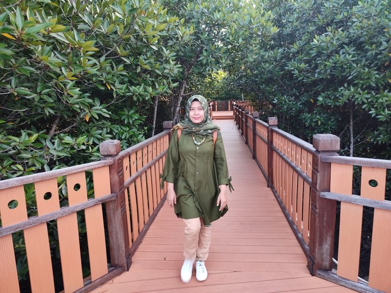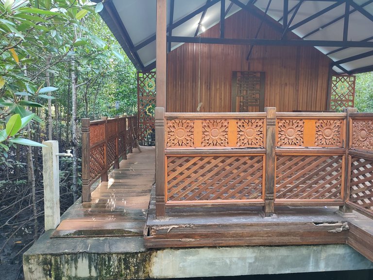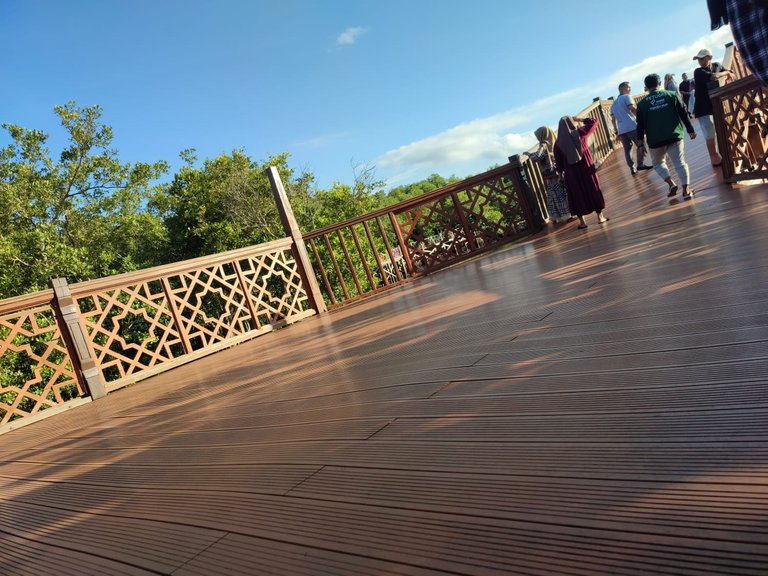 Not only the bridge, in the middle of this mangrove forest there is also a hall which is also made of 100 percent wood. There is no information whether the hall is made of mangrove wood or other types of wood, what is clear is that this building is still dominated by brown color, has a neat design and there are carvings with the sun symbol around the connecting pillars. The building is supported by concrete supports so that it does not collapse and is much stronger. It turns out that this tour in the mangrove forest in addition to making our minds more refreshed to see the green scenery, I was also given a bonus with the existence of buildings with unique designs in them. nice surprise for me.