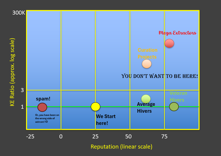 I have published numerous plots on the subject, please feel free to look at them. However, above cartoon is a simplistic but easy to understand (I hope) view of the relationship between Reputation and KE. I think together they tell you a lot of a person's behavior towards long term investment in hive. If you have a high KE and you like to lower it, just power up some hive. It is extremely easy to do especially if your HP is low.