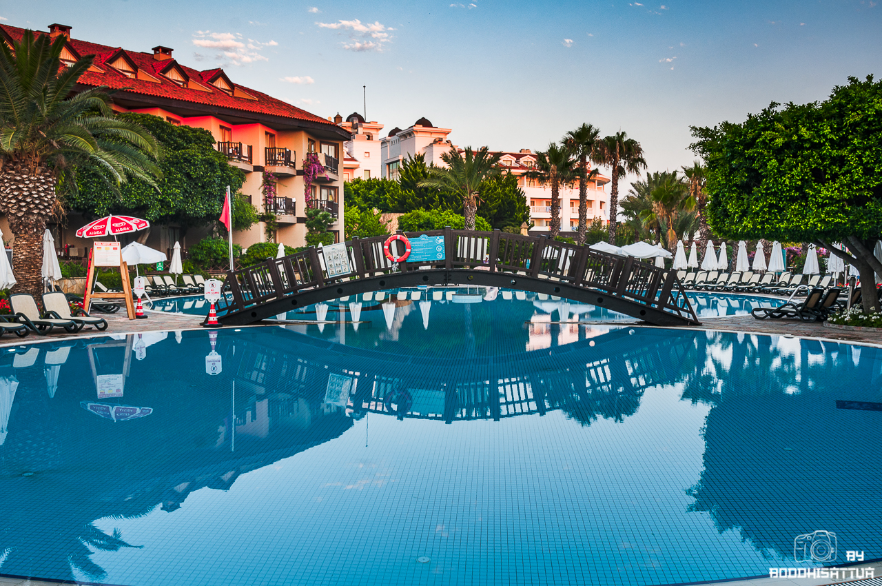 I took this photo while on vacation in Turkey. Like many other hotels, our hotel had swimming pools. Their clear blue water looked very inviting. Passing by, I stopped many times to photograph them. This is one of the photos taken during an evening walk. At that time it was always empty, there were no people and the water was very calm. This is how I managed to capture a great reflection.