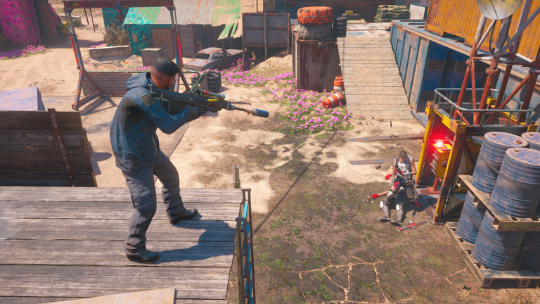 I picked off the remaining guards, intentionally letting the last one trigger the alarm to draw out more enemies. After watching the firework signal, I sniped a turret vehicle and engaged a high level enemy who jumped from a chopper. I tried using an RPG on the pilot, but he managed to escape.