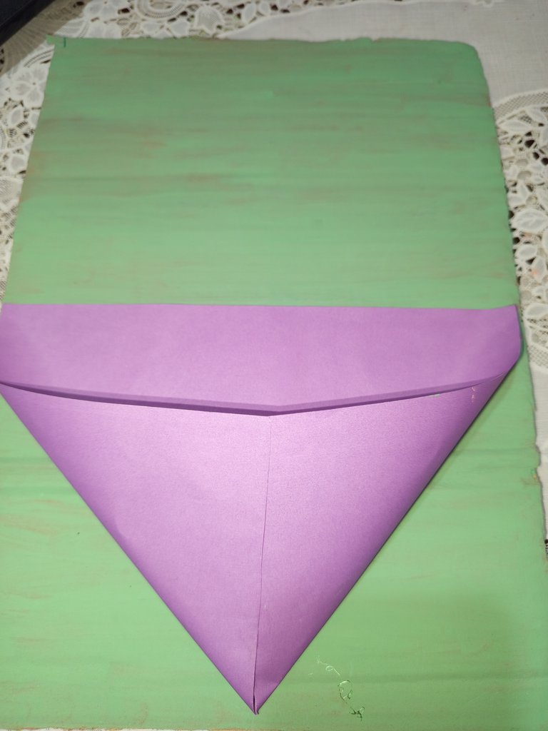 First of all I used cardboard and painted it with green paint and then let it dry. Next I used purple paper folded it in half and then cut it and attached its two corners together with UHU and also attached it with cardboard using the same product (UHU).