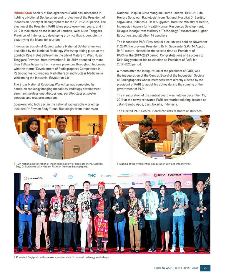 In the journal ISSRT (International Society of Radiographers & Radiological Technologists) published in April 2020, there was a publication on the success in holding a National Deliberations and re-election of the President of Indonesian Society of Radiographers for the 2019-2023 period which we held in Lombok, West Nusa Tenggara Province, of Indonesia.