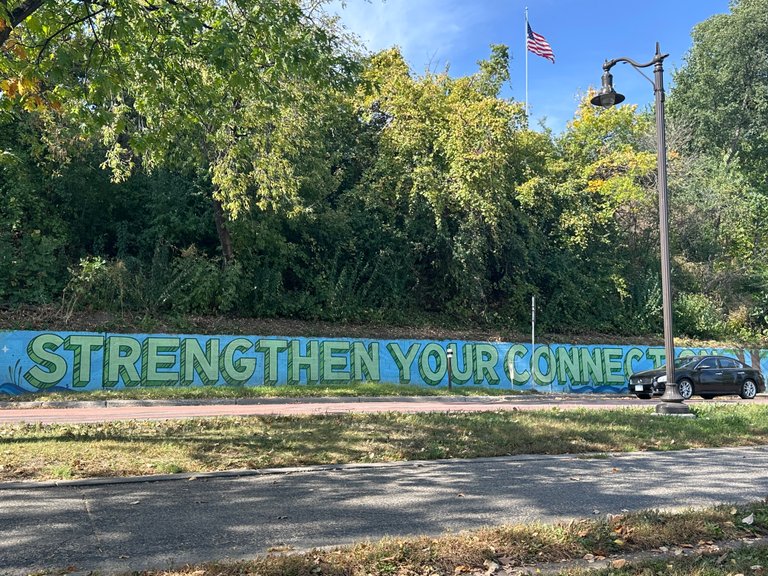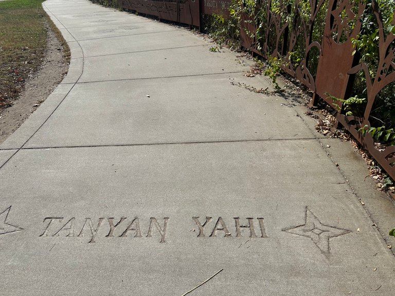 I do love the acknowledgements around the lake, that this is Indian land. There are places where the concrete is stamped with words in the Dakota language, as well as artwork and plaques.
