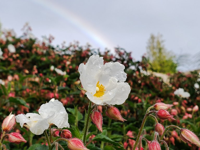 Wow! What a great catch with the rainbow!What a stunning backdrop for those beautiful wild roses. A perfect moment that you captured. The apple blossoms are just starting. Soon, we will see the beginnings of little apples. A welcome sight for birds and humans alike.