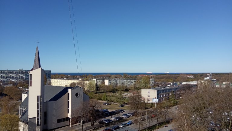 Na koniec zawędrowałem na 8-piętro falowca. Tam z galerii piękny widok na morze. Widać było domy Jastarni i oczywiście także samą mierzeję. W sumie to widać na zdjęciu dwie mierzeje bo w Gdańsku mamy także Mierzeję Wiślaną.