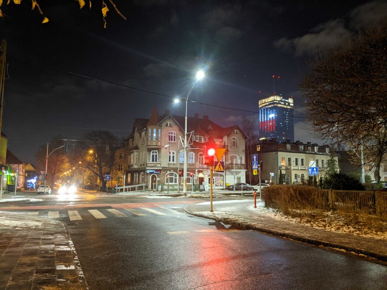 Oliwa ul. Derdowskiego róg Stwosza. Na biurowcu "flaga" upamiętniający wybrzeżowy Grudzień 70