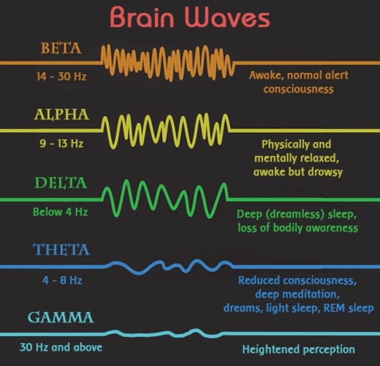 뇌파를 주파수 순서대로 놓고 보면, 주파수가 빠를수록 더 복잡한 상태라는 것을 알 수 있습니다. 뇌파를 CPU에 비교하면 CPU 클락이 빠를수록 더 빨리 일을 처리하듯이 뇌파가 빠르면 더 복잡한 일을 수행한다고 할 수 있습니다.