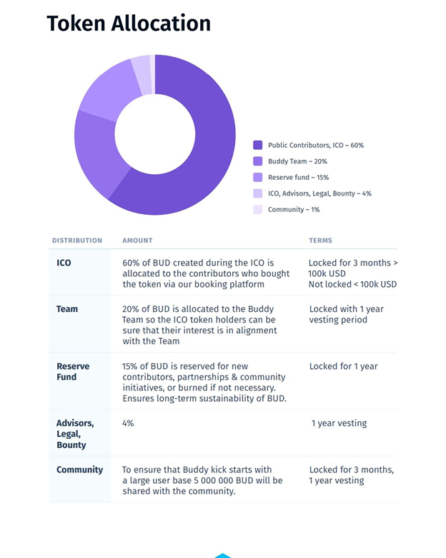 The BUD token the fuel of BUDDY platform,which alsomis used to take the peer to peer exchanges on the BUDDY platform a step higher. Some peer to peer exchanges can include, the payment of a web developer for developing a premium automated script displayed on the DevOps marketplace and so on.