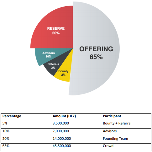 Dafzo will issue its own coin named the Dafzo Coin (DFZ). A strict limit of 70,000,000 will be used which will never be increased. DFZ will run on the Ethereum Blockchain with the ERC 20 Protocol.