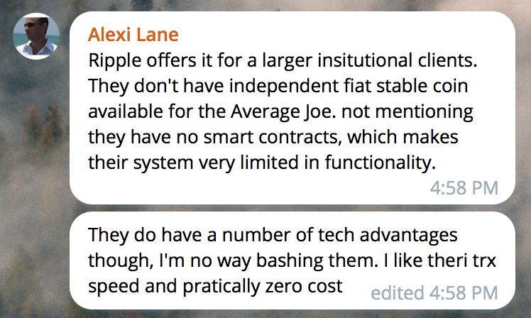 하지만 서비스의 컨셉에 대해 알게되었을때 제일 먼저 궁금해지는 것은 바로 Ripple 과의 차별화(differentiation) 입니다. 리플 코인 또한 송금과 지불에 강점을 갖고 있습니다. 몇 초안에 거래가 체결되어 오히려 이더리움 기반의 Everex 보다 빠른 거래속도를 달성할 수 있습니다. 아래는 제 질문에 대한 CEO의 답변입니다.