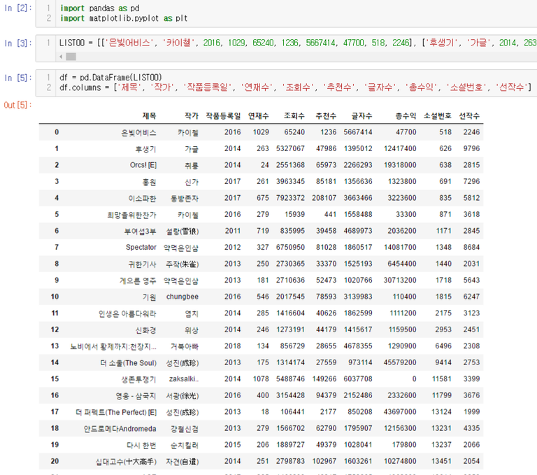 이번 포스팅에서는 억대를 버는 작품들을 찾아내는 것이 목적이기 때문에 아쉽게도 반응이 미미했던 작품들은 걸러내보겠습니다. 코드가 지저분한 점 죄송합니다