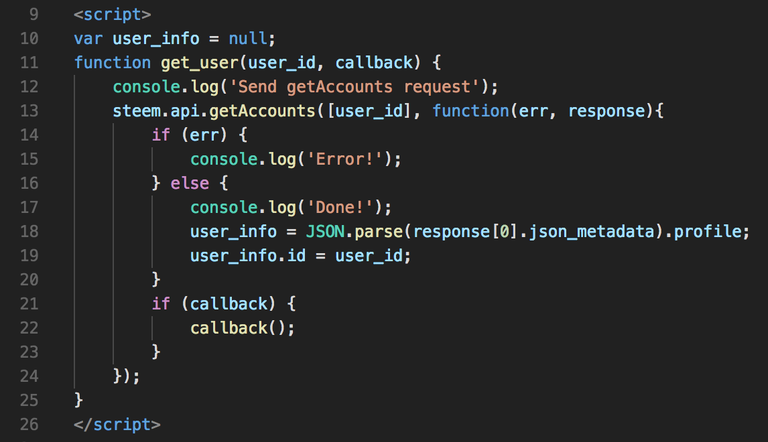 function 은, 이제부터 함수를 선언한다는 의미입니다. 그 뒤에는 함수의 이름을 적습니다. 여기서는 get_user죠. 그 다음줄에 괄호를 열고 닫으면서 user_id와 callback이 적혀 있죠? 이것들이 파라메터 입니다. 이 함수는, 사용자 ID와 콜백이라는 것을 넣어서, 그 사용자의 정보를 얻어오는 기능을 할것이라는것을 미루어 짐작 할 수 있습니다.