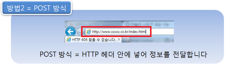 - GET : 주소창에 정보를 노출시키는 방식 (URL에 변수를 포함시켜 요청)