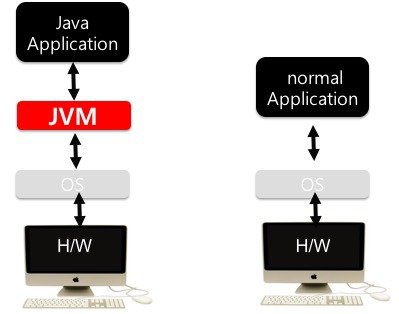 그림처럼 일반어플리케이션은 OS와 맞붙어 있기 때문에 OS종속적이다. 그래서 다른 운영체제에서 실행시키려면 어플리케이션을 그 os에 맞게 변경해야하는 번거로움이 있지만 자바 어플리케이션은 JVM하고만 상호작용을 하기 때문에 OS 및 하드웨어에 독립적이라 다른 OS에서도 프로그램 변경없이 실행가능한것이다. 단, JVM은 OS에 종속적이기때문에 해당 OS에 맞는 JVM이 필요하다 . 이로써...