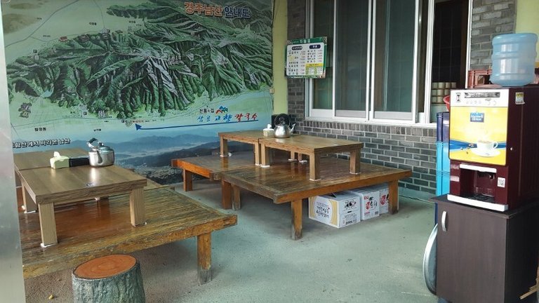 땀을 흘린 등산객들을 위한 실외 식탁들.