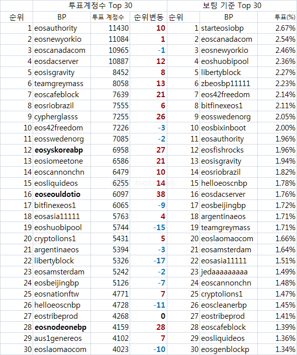 한국 BP 이번주 순위는 eosyskoreabp(33),eosnodeonebp(49),acroeos12345(50),eoseouldotio(56) 입니다
