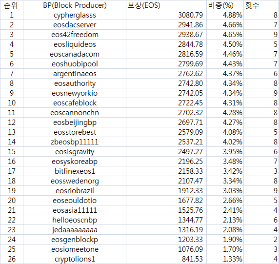 26 개 BP만이 블럭 보상을 받았다는 것은, 전체 BP 중 26 업체만이 대표 BP 가 되었다는 것을 의미 합니다.
