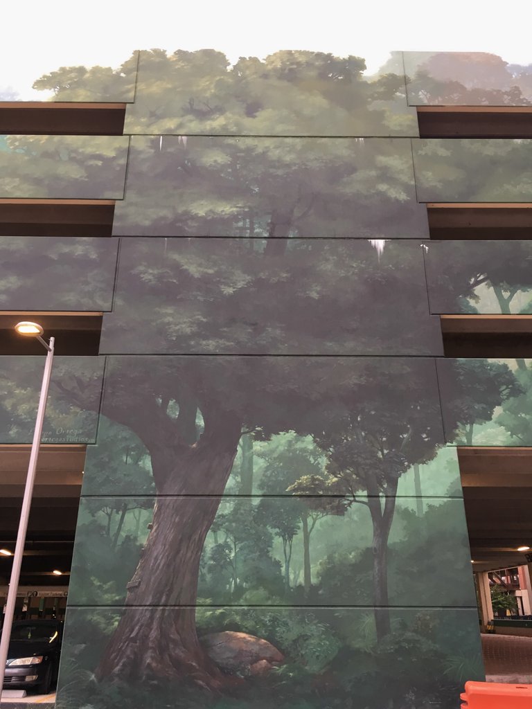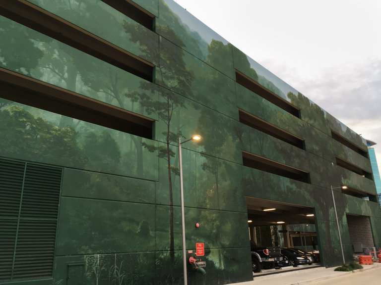 빌딩사이에 있는 주차장 건물인데 외벽을 다 벽화로 그렸네요.
