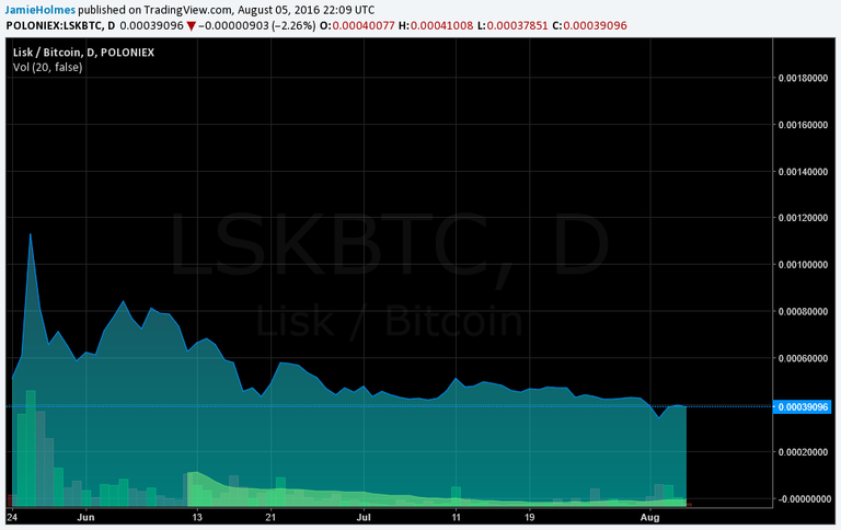 At the time of writing this article, the value of LSK-BTC on the Poloniex exchange stands at 0.00039, near all-time lows. From a contrarian perspective, this makes Lisk an attractive buy as the relatively low price at this moment in time suggests there is less resistance to the market moving to the upside rather than the downside.Since LSK hit the exchanges on May 24th the price saw an initial jump against BTC and then steadily declined since mid-June. Recently, LSK received more investor demand and it’s price surged against BTC.