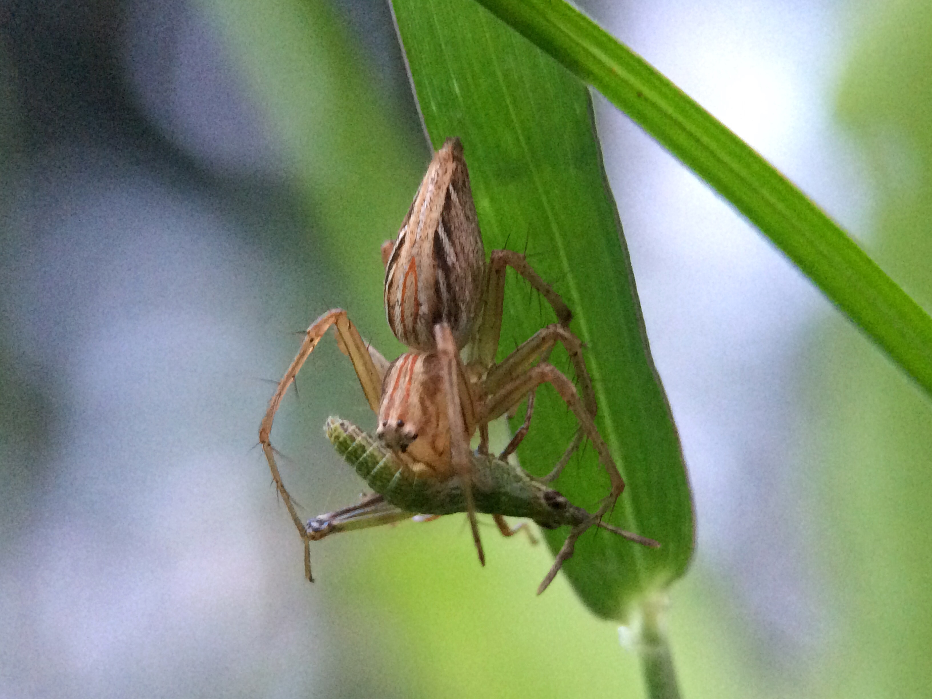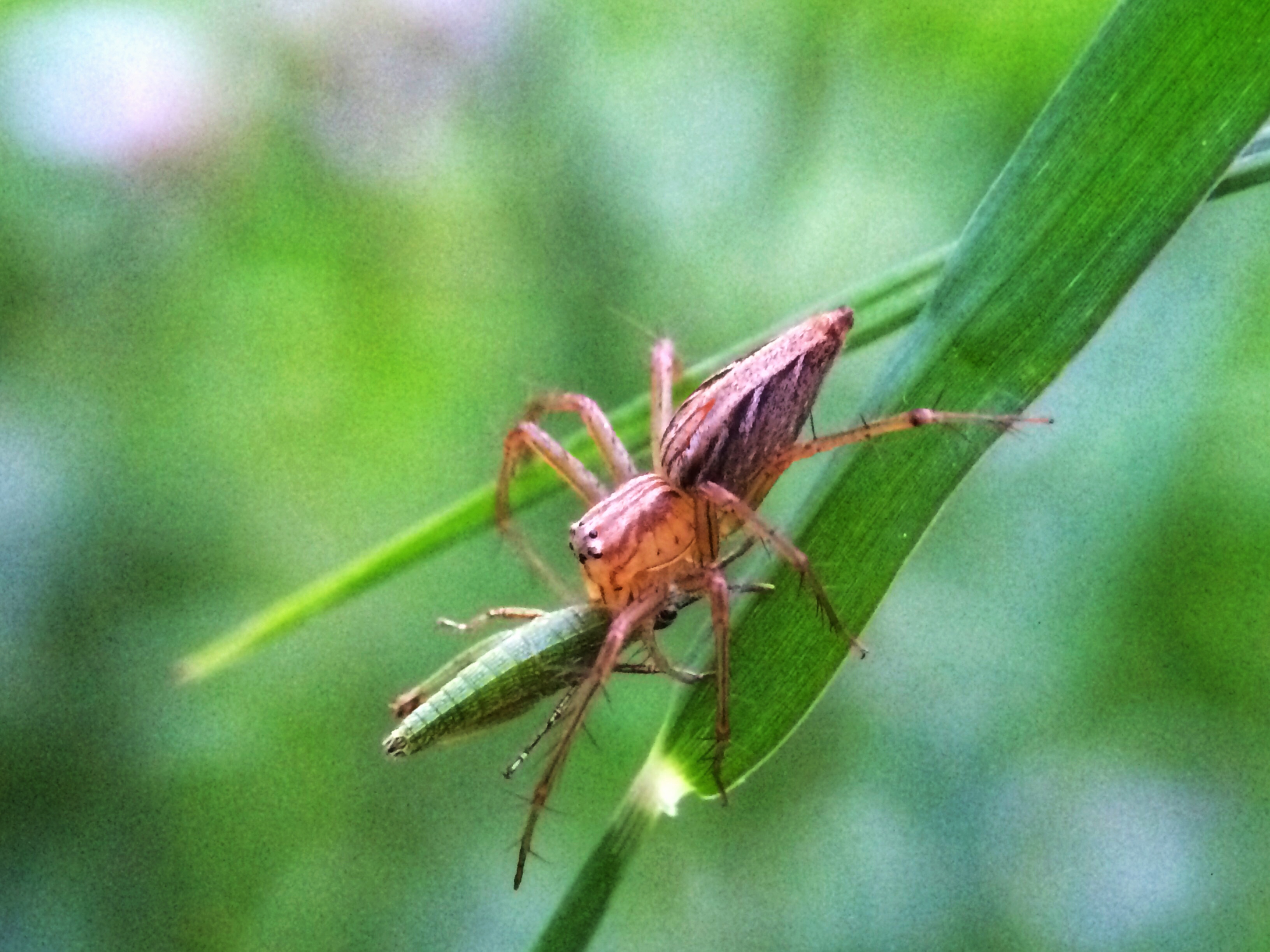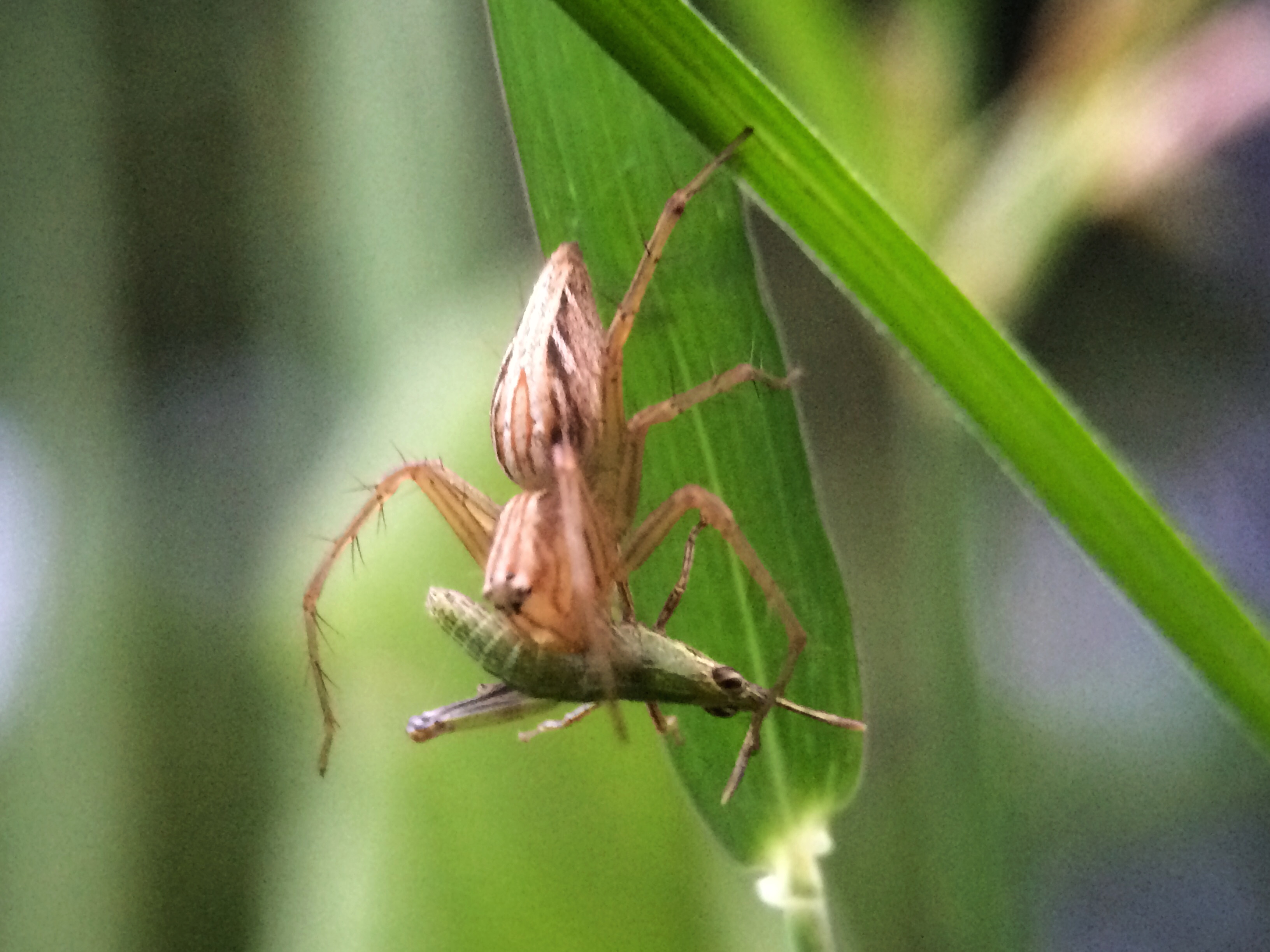 Today I found a spider who was hunting for food and he has managed to get a meal to eat, I see this spider is chewing an animal but I do not know what animal is chewing by this spider.
