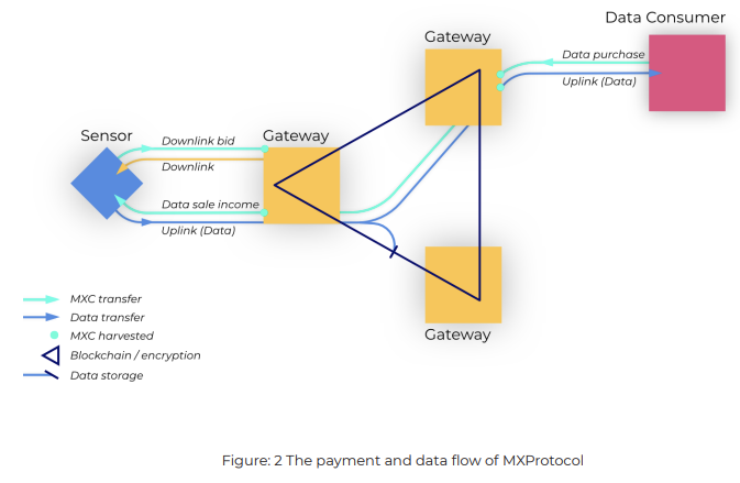 The above given figure shows how MXC will be working. All the sensor communications are bi-directional with a gateway which shares its data and receives some income in return. All the the gateways are connected to each other to form a interlinking network. The decentralized and autonomous LPWAN, which as act a connection point between the gateways, can be built on any permissionless blockchain. All the received data are then sold to data consumers.