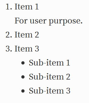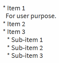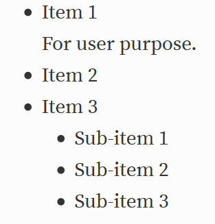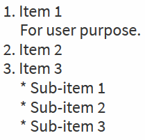 နံပါတ္စဥ္ မတပ္ဘဲ မိမိ၏ post တြင္ item မ်ားကို ေဖာ္ျပသည့္အခါ list ျပဳလုပ္ႏုိင္ပါသည္။ * သေကၤတကို ေရွ႕မွ ခံကာ space bar ျခားျပီး list item တစ္ခုခ်င္းစီကို အစဥ္အတိုင္း ခ်ေရးေပးရပါသည္။ နမူနာျပသထားသည့္ပံုစံကို ေအာက္ပါအတိုင္း ေလ့လာႏိုင္ပါသည္။