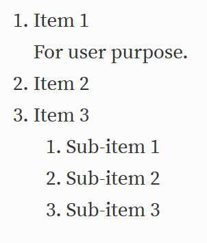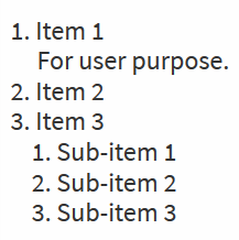 နံပါတ္စဥ္အလိုက္ေရးသားခ်င္ပါက 1, 2, 3 အစရွိသည့္ နံပါတ္မ်ားကို တပ္ကာ ေအာက္ပါအတုိင္း ေရးသားရပါမည္။ နံပါတ္စဥ္ႏွင့္ item မ်ားၾကားတြင္ space bar ျခားေပးရန္ မေမ့ပါႏွင့္။