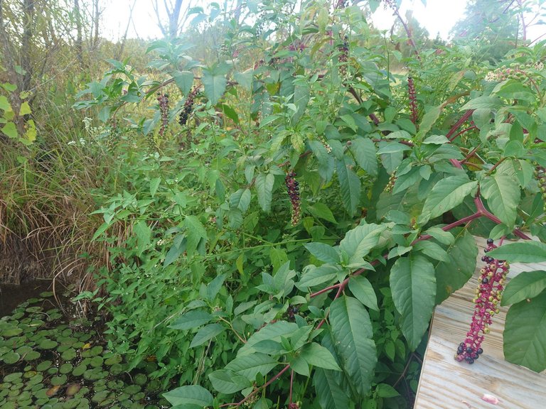 Lots of plants growing around here, not all edible. That Pokeweed seems happy, hope the birds like it. Not safe for humans to eat.