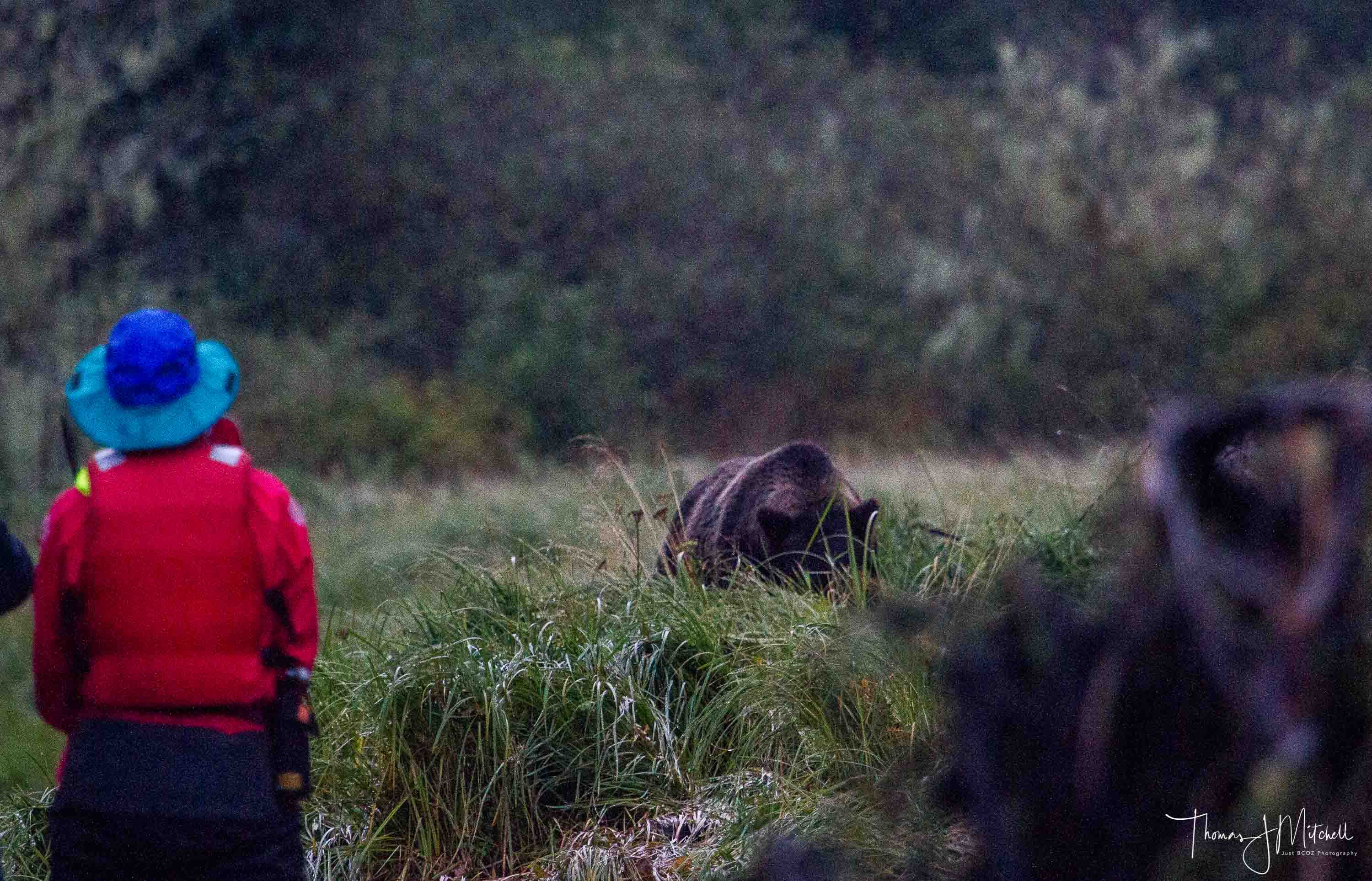 The guy in the blue hat is one of the most experienced guys when it comes to interacting with Grizzly Bears along the BC coastline, and my boss. What you can't see is that there is 8 other people next to him, which he is standing in front of with bear spray strapped to his hip to use just in case. However, he can not recount the last time he actually had to use the spray, as all of the encounters are passive and positive interactions.