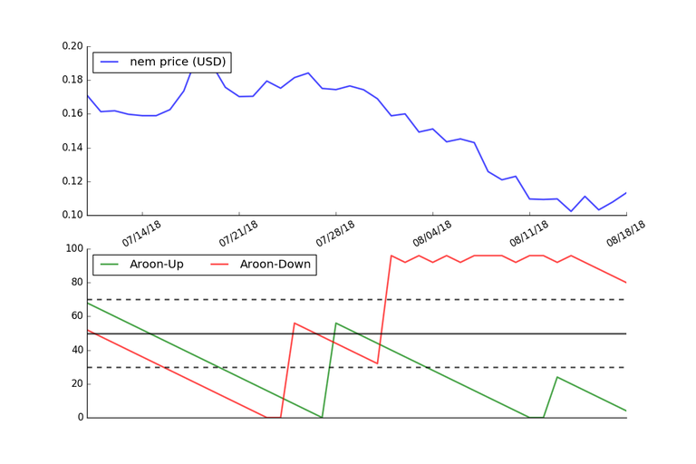 The graph below shows the Aroon Indicator using the price of Nem over the last 40 days.