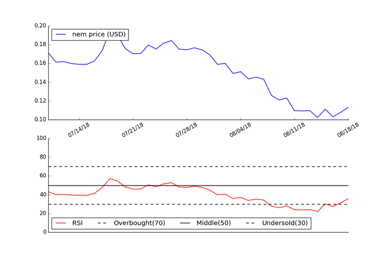The graph below shows the RSI applied to the price of Steem based on daily price data for the last 40 days.