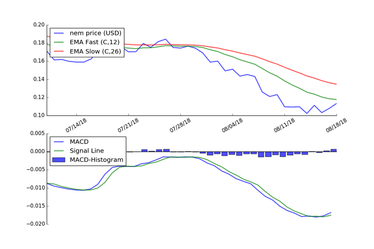 The graph below shows the MACD applied to the price of Nem using daily price data for the last 40 days.