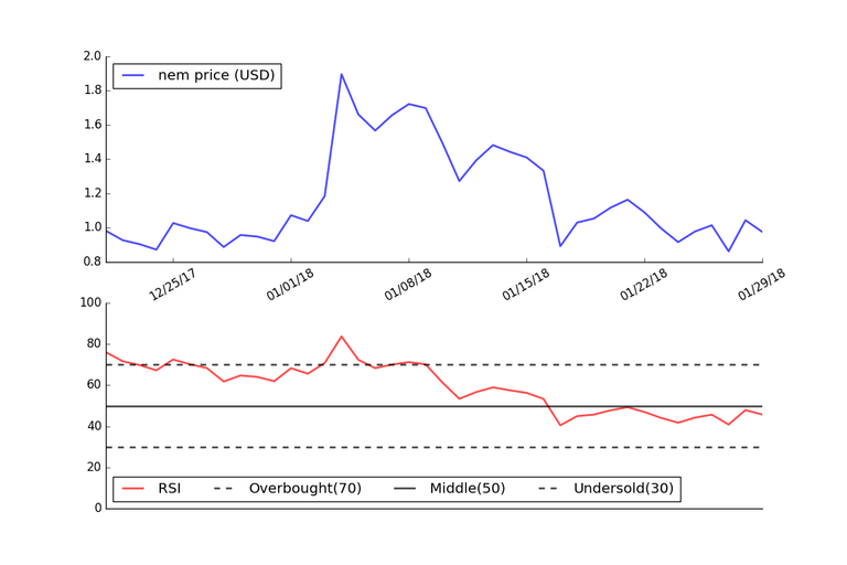 The graph below shows the RSI applied to the price of Steem based on daily price data for the last 40 days.