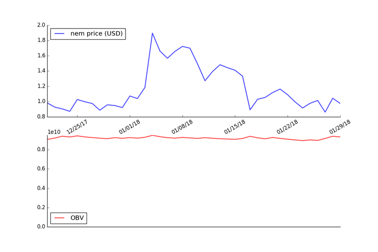 The graph below shows the OBV applied to the price of Nem using daily price data for the last 40 days.