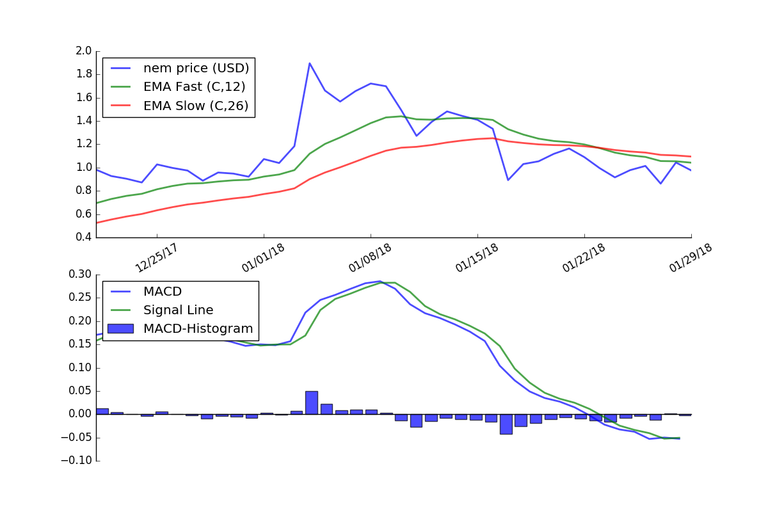 The graph below shows the MACD applied to the price of Nem using daily price data for the last 40 days.